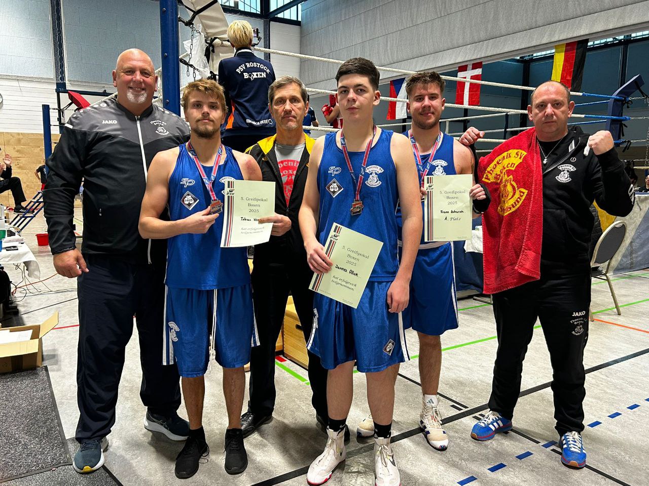 In der Hanse- und Universitätsstadt Rostock veranstaltete der PSV Rostock die fünfte Austragung des internationalen „Greifipokal Boxen“. Phoenix-Boxer Kusai Kakah setzte sich gegen einen Boxer aus Dänemark siegreich durch und belegte den ersten Platz. Die Schüler Hilal Ferdusi und Artiom Isaev zeigten sehr gute Leistungen in ihren Sparringskämpfen. Premiere hatte in diesem Jahr das „Sportboxen“. Bei den Breitensport-Wettkämpfen für Erwachsene stiegen auch drei Männer des Phoenix SV in den Ring. Carsten Bast amtierte in Rostock als Punkt- und Ringrichter. In zwei Wochen stehen bereits die nächsten internationalen Wettkämpfe in Gdansk/Polen an.